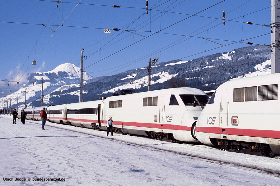 Zur Untersuchung des Schnee-Eintrags in die offenen Bugräume bei einer Doppelzugbildung wurden die ICE/V Triebköpfe Nase an Nase gekuppelt und mitsamt der ICE/V Mittelwagen in einen ICE1 Serienzug gehängt. Aufnahme am 31.01.95 im Bahnhof Kirchberg in Tirol an der Giselabahn in Österreich. |